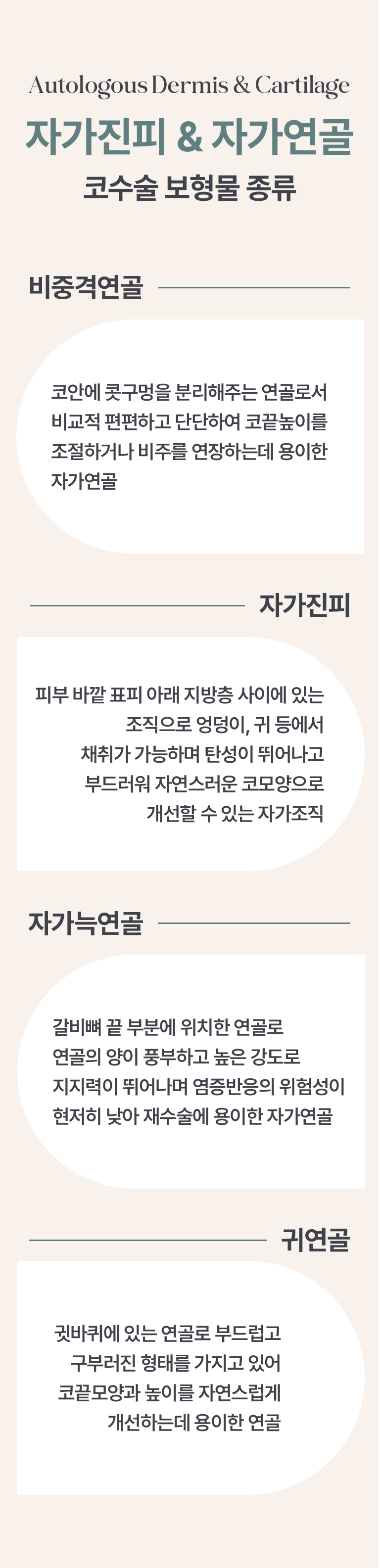 피부 바깥 표피 아래 지방층 사이에 있는 조직으로 엉덩이, 귀 등에서 채취가 가능하며 탄성이 뛰어나고 부드러워 자연스러운 코모양으로 개선할 수 있는 자가조직